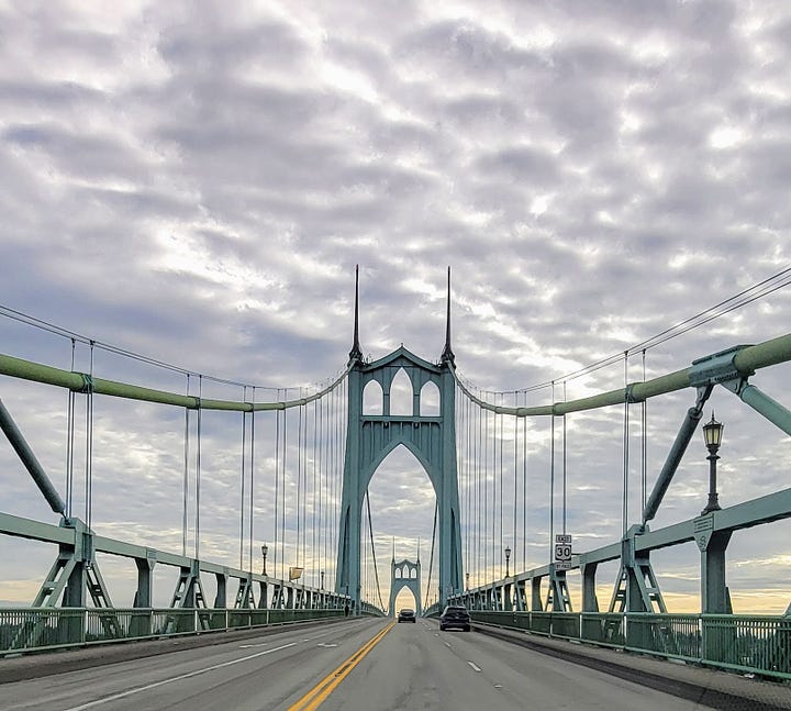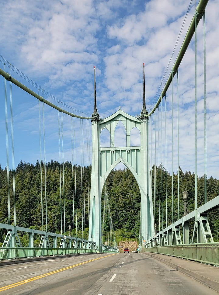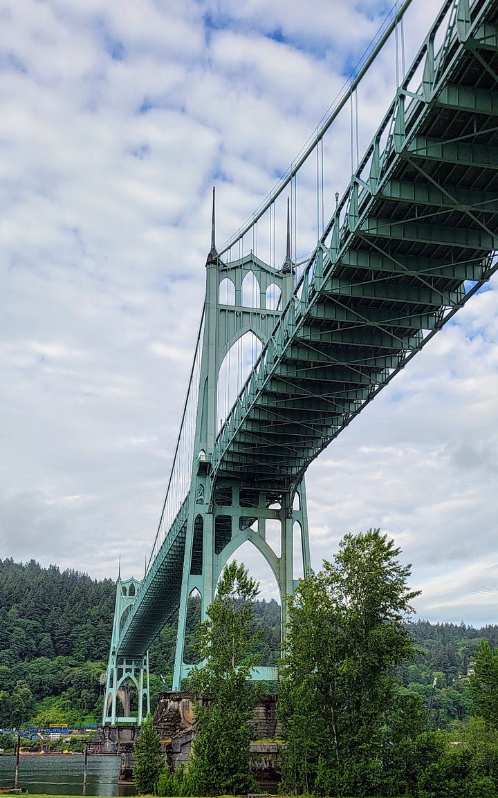 The St. Johns bridge is the northern/western-most of the twelve bridges that cross the Willamette River in Portland. It has many other superlatives as well; namely, it is the most beautiful among them, or really any bridge in America in my opinion and other’s.