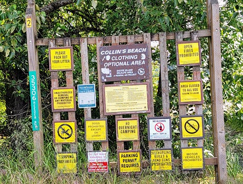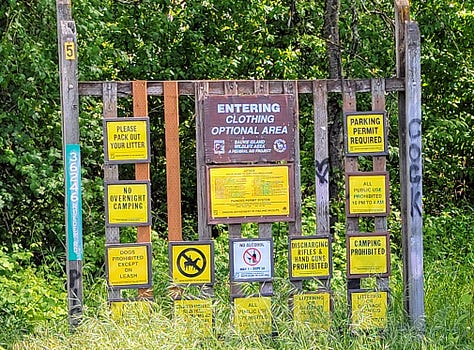 Portland’s oddities also extend to Sauvie island and are readily visible. As soon as one crosses the Waputo bridge (and scattered again throughout the island) there is a sign reminding everyone that alcohol is prohibited on the island May to Sept due to summertime alcohol-related problems. Seems people can’t control themselves here either. This is followed about 15 minutes up the road with signs for multiple nude clothing optional beaches.