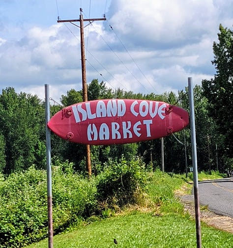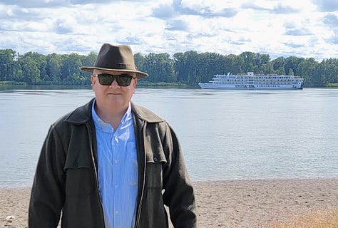 I made a loop of the island, checking out the lay of the land, but given the timing most of the fruit on the island wouldn’t be ready for picking for another month or so and most everything was closed. There is a small market right at the entrance to the left of the bridge, and another further up the island, along with some private hunting clubs, but no other retail or shopping is on the island. I stopped at one of the regular beaches (Yes, I wore my clothes) on this 60-degree Sunday morning, just as the American Cruise Lines Northwest Pioneer Cruise was heading downstream.