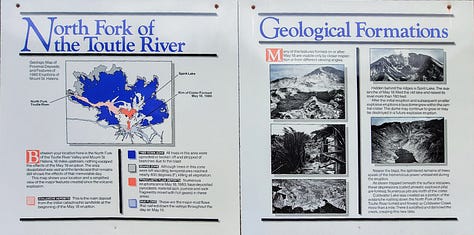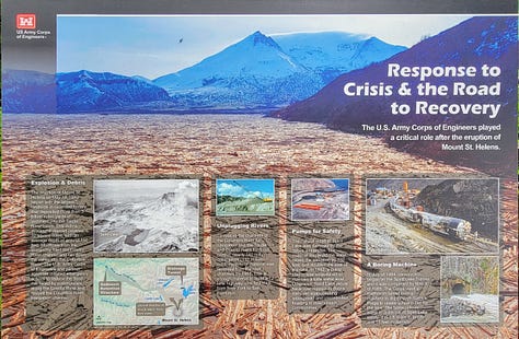 Next up was milepost 33, the Forest Learning Center. Inside they have some dioramas and a 6–8-minute video of 1980 news broadcasts showing the eruption. There is also a short trail and overlook where one can see the expansive mud field.