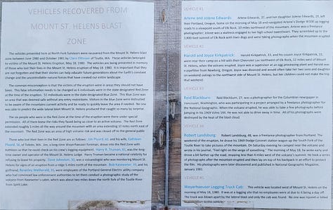Inside the main store I met one of the proprietors who was wearing a hat similar to mine. I’m not sure if it was the hat or the fact that I was interested enough to step foot in his store, but as the local eruption historian he proceeded to spend the next 15 minutes telling me stories about the eruption, his connection to the victims, his efforts to curate artifacts and build a more permanent display than the cases he had in his store and more. I didn’t catch his name, but it was a fascinating discussion and if in the area I recommend stopping in to see the displays and hear the stories. While there were also casts of “Bigfoot” in the display cases, the discussion stayed firmly on the eruption and its aftereffects.