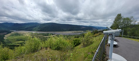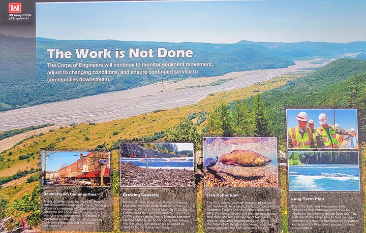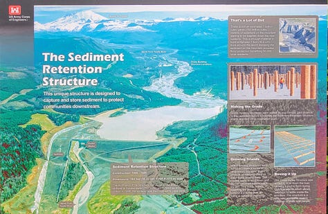 Shortly after leaving this attraction at milepost 22 I pulled into a parking lot and walked up a short but lusciously green trail to see the Toutle River Sediment Retention Structure. The importance of this structure being that even though there was enough mud from the original blast to build a highway 1-ft thick around the equator, there is still a lot of material upstream that needs to be stopped from inundating the downstream towns.
