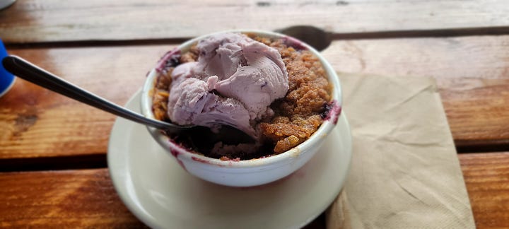 When the food arrived I thoroughly enjoyed the burger, and I ate about half the chips and had to stop as they were too thick and too fried making them very hard to eat. I heard another patron ordering dessert, so I ordered up their house made Huckleberry cobbler with Huckleberry ice cream. It looked photogenic upon arrival but once I dug in the crumble on top was soft and almost cakelike, not the crumbly consistency one would expect from a cobbler. The fruit filling was bland as was the ice cream. I ate 3-4 bites, paid and left.