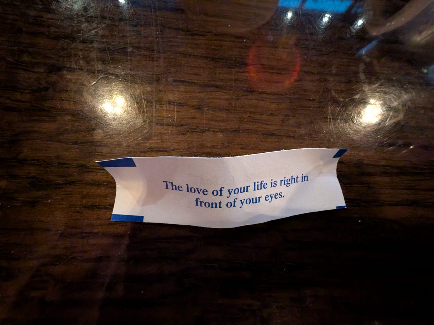Even though the food wasn’t 100%, we had a good time, and I ended the meal with a fortune that bode well.