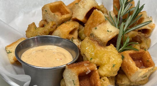 While we were right next to each other, because we sat at separate tables, I didn’t have an opportunity to get photos of what the kids ordered and had to use photos from the restaurant’s website. They had the Chick Pops (Crispy fried chicken and waffle bites with maple syrup. Served with spicy mayo) and the Crispy Chicken Benedict (Cherry tomato, red bell pepper, onion, spicy hollandaise sauce).