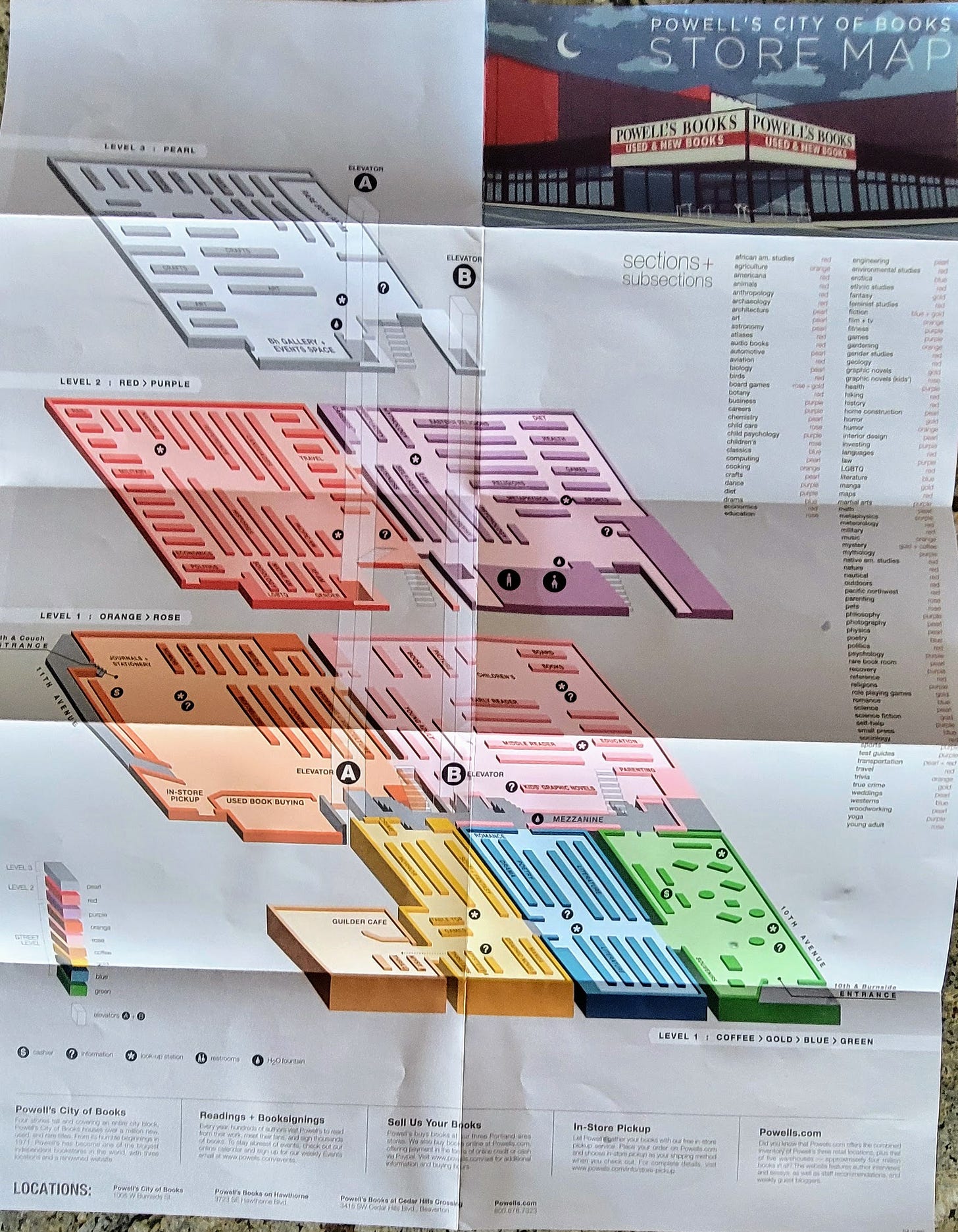 Battling rush hour traffic (though we were counter commuting east back into the city so there was nowhere near as much traffic as that heading west on 26) we headed into downtown Portland to visit Powell’s City of Books, the largest bookstore in the world with over 1 million volumes on site.