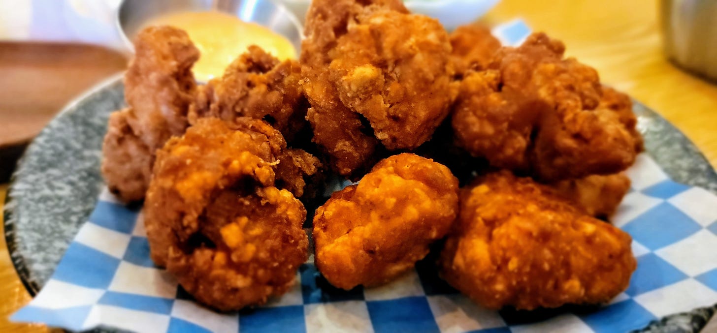 …and Boneless Kaarage (A Japanese technique of using potato starch on marinated meat to make incredibly crispy but juicy fried chicken.)