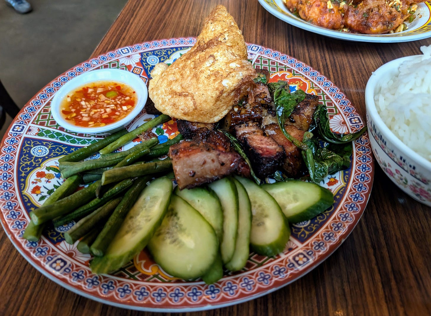 As much as this dish could stand in for wings, and does so convincingly, I was very much in the mood for meat as well. Next up was the Smoked Pork Krapao. The plate arrives with eight to ten pork belly burnt ends, rich and smoky, tossed with Thai chilies and sautéed Thai basil. A punchy nam prik plaa adds sharpness, a fried egg unlike any I have encountered elsewhere adds richness, and crisp fresh cucumber slices keep the whole thing from tipping too far into indulgence..