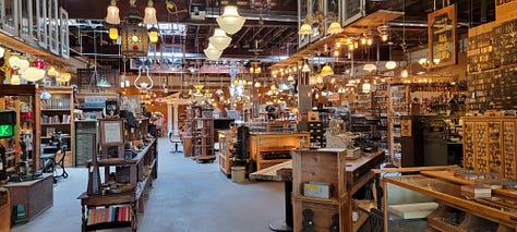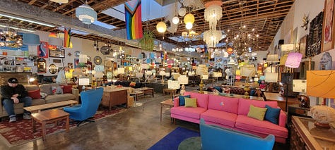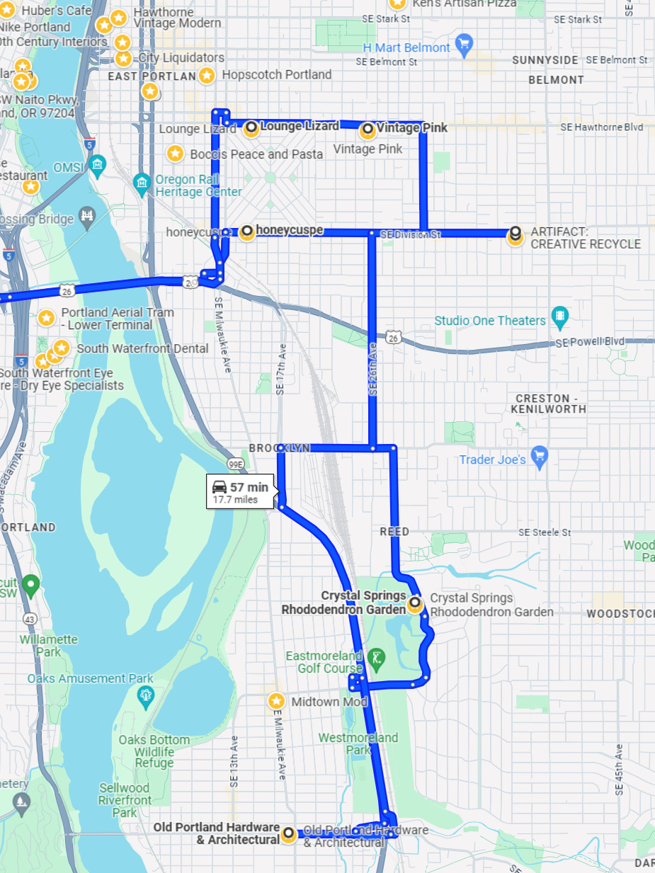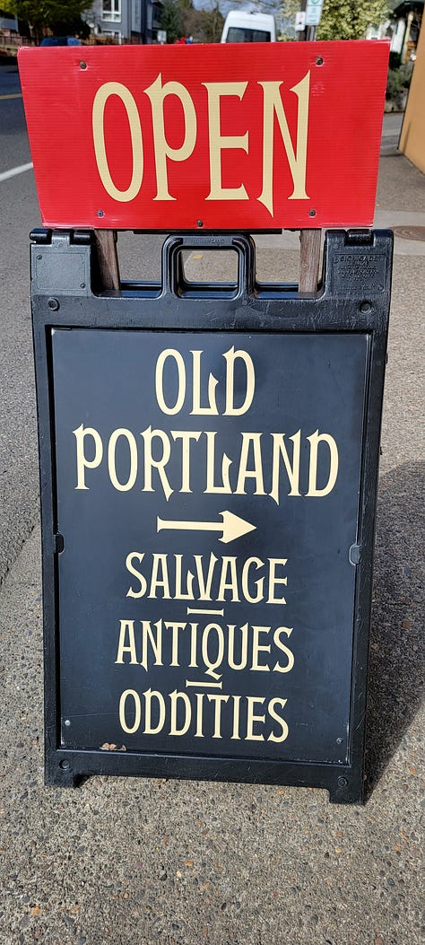 The rest of my day was spent antiquing around Southeast and Northeast Portland. This city is full of Victorian and mid-century antique and architectural recycle stores, (think Victorian door knobs, lights, fireplace mantles and more) and for someone into history like me it’s a blast just walking through these places. With our new home we are looking for a little different vibe than we had in Folsom where our home was stucco sided with ceramic tiled roof and rounded corner walls. Here our home, having been built in 1974 and remodeled since then, has a more mid-century modern feel and for the most part (but not all) that is what we are trying to evoke through furniture, artwork and knick knack selection.