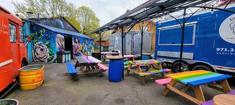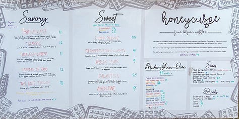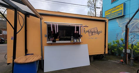 I allowed myself to sleep in a little, then lounged around a bit because I knew my first stop wouldn’t open before 9am. Leaving the house at 0850 I headed for Honeycuspe, a food cart just across the Ross Island Bridge that specializes in waffles. I was the first one to arrive 5 minutes before opening and had the courtyard to myself.