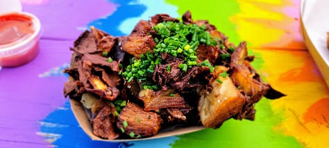 If you’ve never had Pave Potatoes (I hadn’t. I had to look them up to even see what they were even though I had seen some pictures online in the Honeycuspe reviews. While doing that I found this incredible recipe from Thomas Keller) they are something to be experienced. Think mandolin-thin scalloped potatoes that have been further compressed, baked, cooled, then cubed and fried. They are crispy crunchy on the outside and light and fluffy on the inside (kinda like these waffles). They looked extremely delicious when served, but I feel they were overcooked and while they weren’t directly greasy they felt heavy and I think they needed to change their oil.