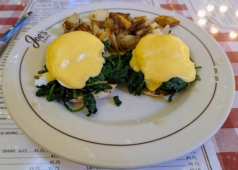 Joe’s feels like stepping into a time capsule: mahogany bar, leather booths, and waitstaff who seem to know everyone who walks in. Being the first diner of the day, I had my pick of tables and ordered the classic Eggs Florentine with a side of potatoes. The presentation was tidy, but the lack of flavor left me wanting more, pleasant but ultimately forgettable. Still, with its central location and old-school charm, Joe’s earns another chance, perhaps over lunch next time.