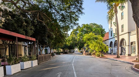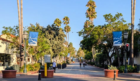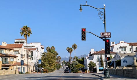Leaving Joe’s, I found downtown Santa Barbara nearly empty, quiet streets lined with Mediterranean architecture, and street signs lettered in the city’s distinctive Mission font.