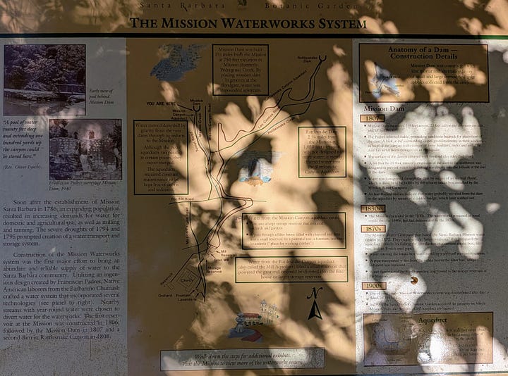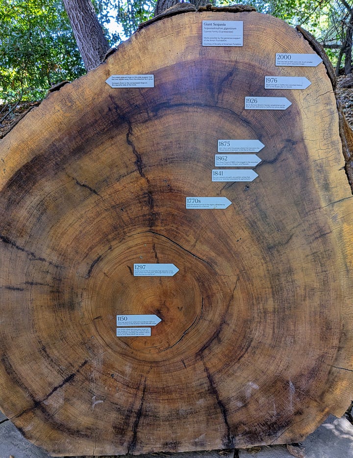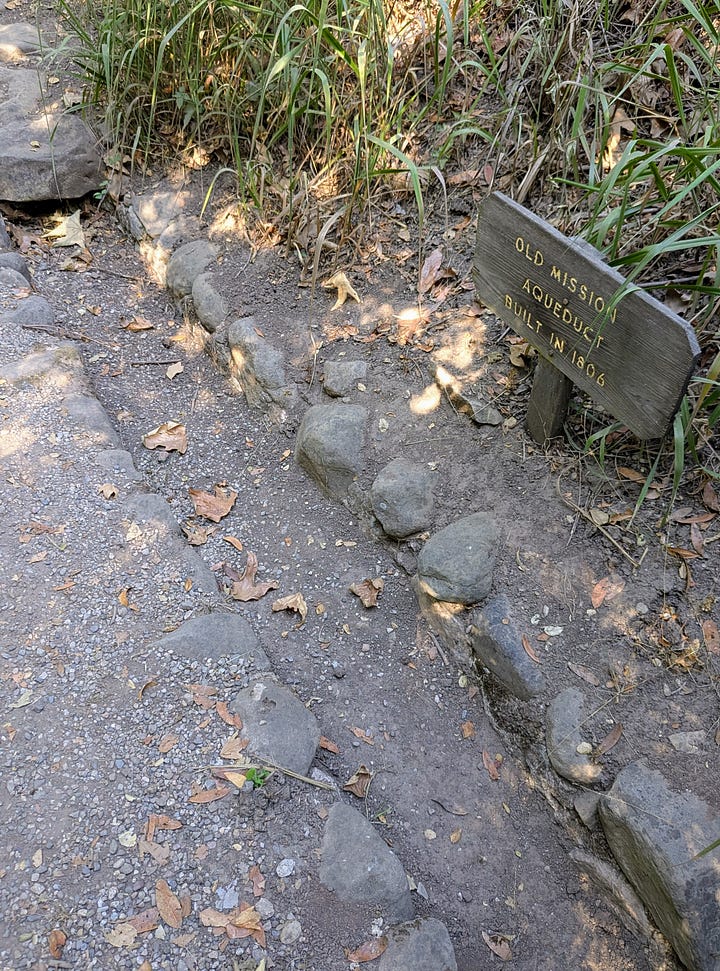 Along the way, remnants of the 1806–1807 Mission Waterworks aqueduct trace the hillside for the 1 1/2 miles down to the Mission, a tangible link to the area’s early history. One of the most striking features is a fallen Giant Sequoia section, its rings marking nearly 900 years of growth.