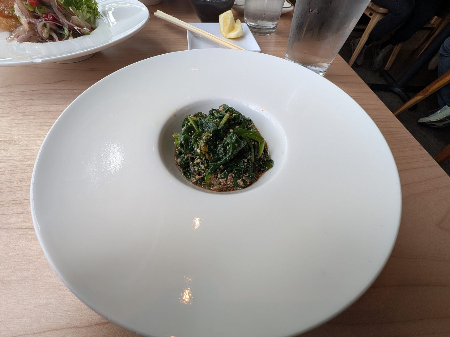 We wasted no time in ordering during our second visit because we automatically knew we would be getting not one, but two orders of their Spinach Gomae, a seasoned organic salad. This is spinach unlike anything I've ever had. The organic spinach leaves were perfectly coated in a subtly sweet and nutty dressing. The sesame paste offered a creamy richness, while the hint of soy added a savory depth that made each bite irresistible. At $8 per order you will want at least one order per person because after the first bite you won't want to share.