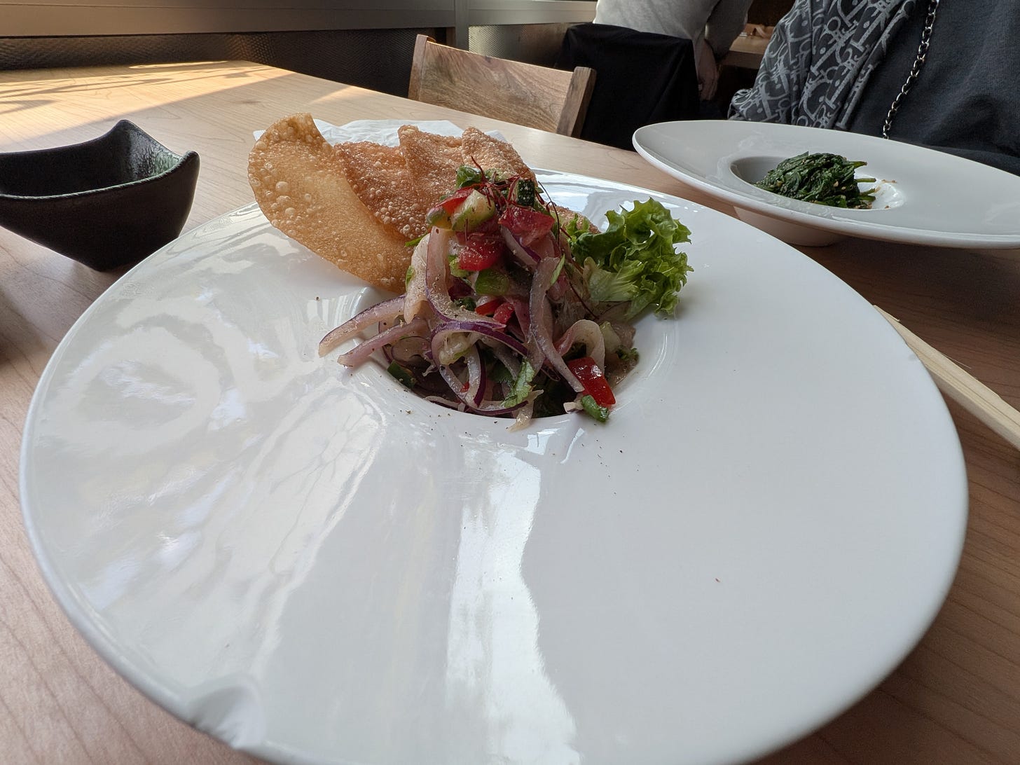 A vibrant Sashimi Salad arrived next, a colorful medley of ruby red tuna and delicate slices of white fish, all nestled atop a bed of fresh, crisp mixed greens. The creamy Miso dressing, with its subtle umami notes, coated each piece, while a side of golden, crispy wonton strips provided a delightful textural contrast."